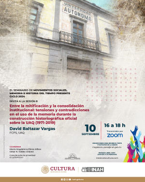 INSTITUTO NACIONAL DE ANTROPOLOGÍA E HISTORIA DIRECCIÓN DE ESTUDIOS HISTÓRICOS SEMINARIO DE MOVIMIENTOS SOCIALES. MEMORIA E HISTORIA DEL TIEMPO PRESENTE CICLO 2024 Invitan a la sesión virtual número 8 Entre la mitificación y la consolidación